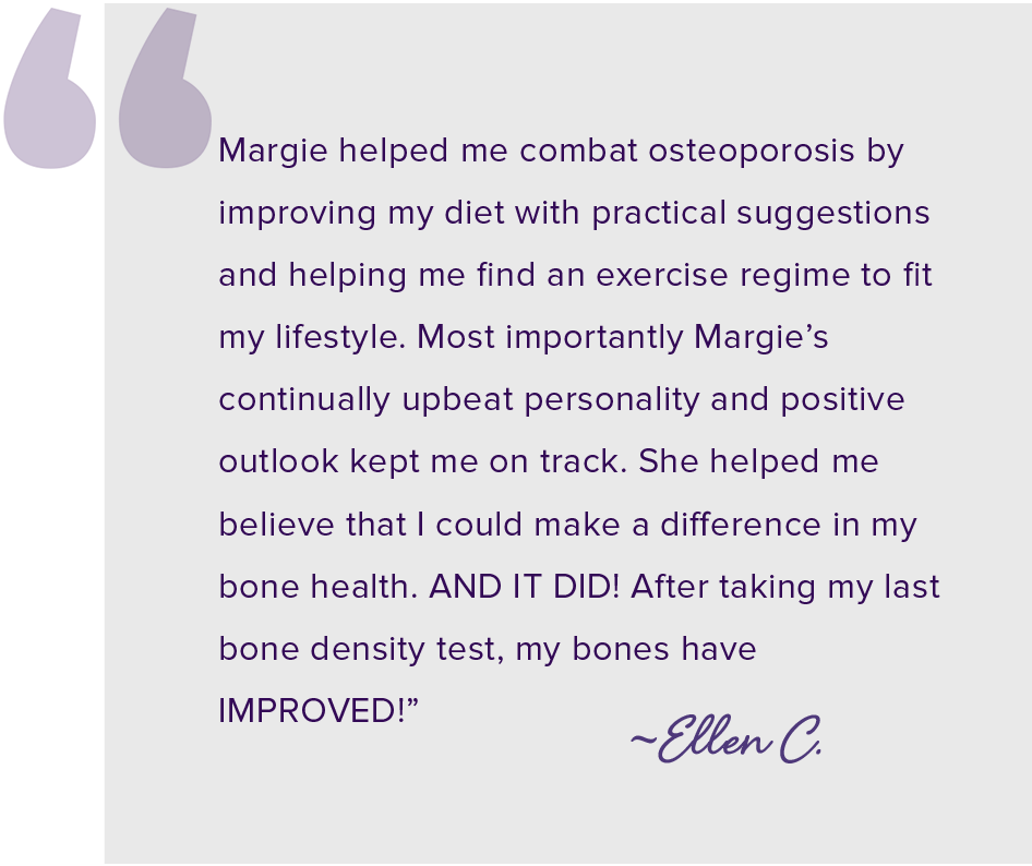 I just completed Margie's entire program. I have learned so much, feel stronger and much more optimistic about my bone health than before I started. Margie's exercise nutrition program is so complete and also safe for someone like me who already has osteoporosis. The exercise videos and nutritional guidance is presented in such a clear and concise manner. Margie also makes it fun. My overall health has definitely improved. There are so many extras in each module (i.e. who knew.' some teas can help build bone density). I'm so thankful that my doctor referred me to Margie. Thank you Margie for answering my many questions and being so helpful and supportive in every way. You are very dedicated and will go that extra mile to find the answers. We need more people like you in the medical field. You are a joy to work with and your program is truly life changing!"