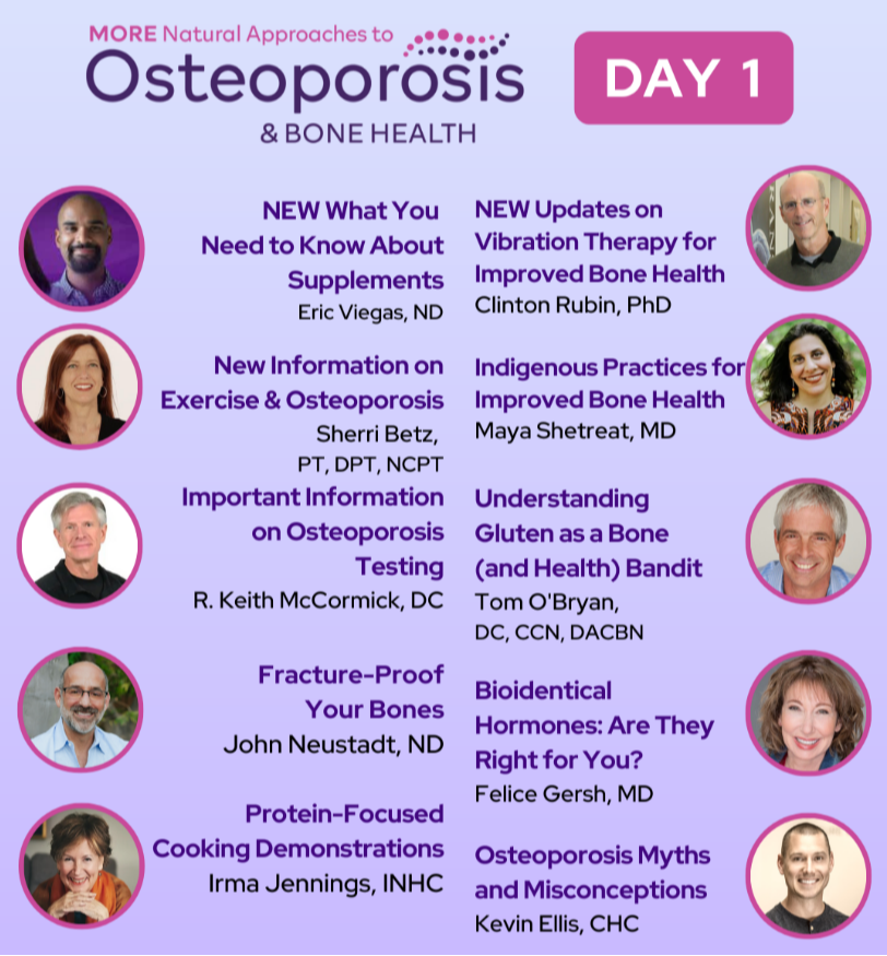 On Day One we'll be talking about how we can fracture-proof your bones and exploring common myths concerning osteoporosis with hands-on lessons! You will see demonstrations of safe and effective exercises for strong bones, and have the opportunity to join a world-class cooking demonstration on whipping up bone-building food. Our experts discuss comprehensive testing, supplements, bio-identical hormones, gluten, how protein is a KEY to your nutrition, and how to use a low-intensity vibration plate.