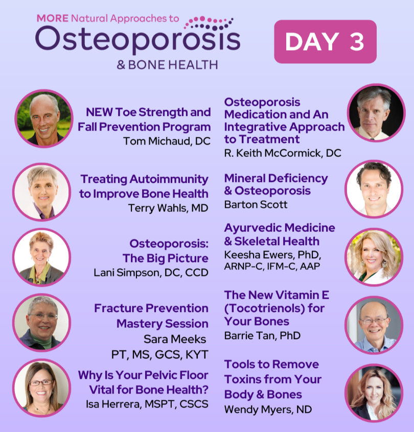 On Day Three you'll learn why toe strength is so important to prevent falls and exercises to increase toe strength. You will discover the pros and cons of osteoporosis medications and how they can be used in an integrative approach. Also find out about mineral deficiencies and toxins that can increase bone loss - and what to do about it, and why a DEXA scan may not be the most effective tool.