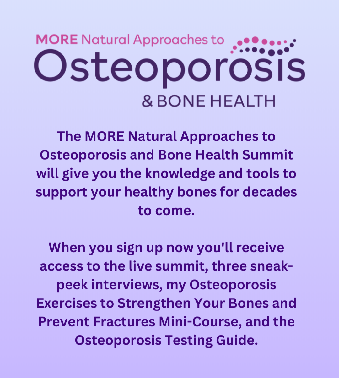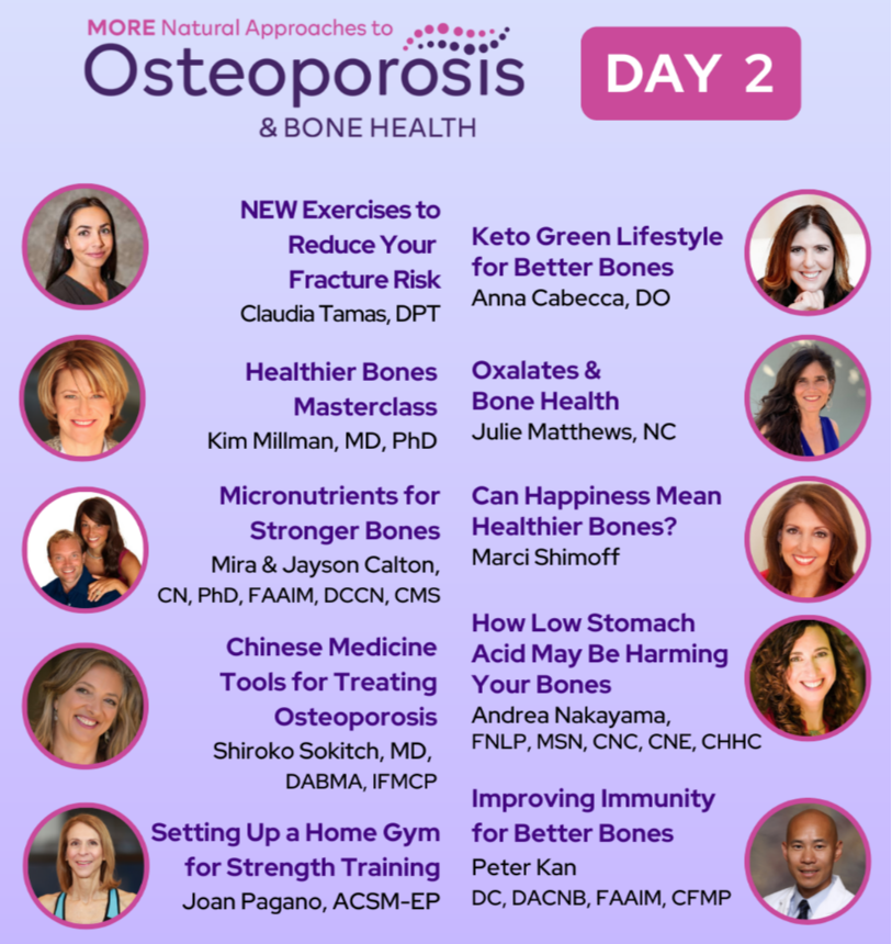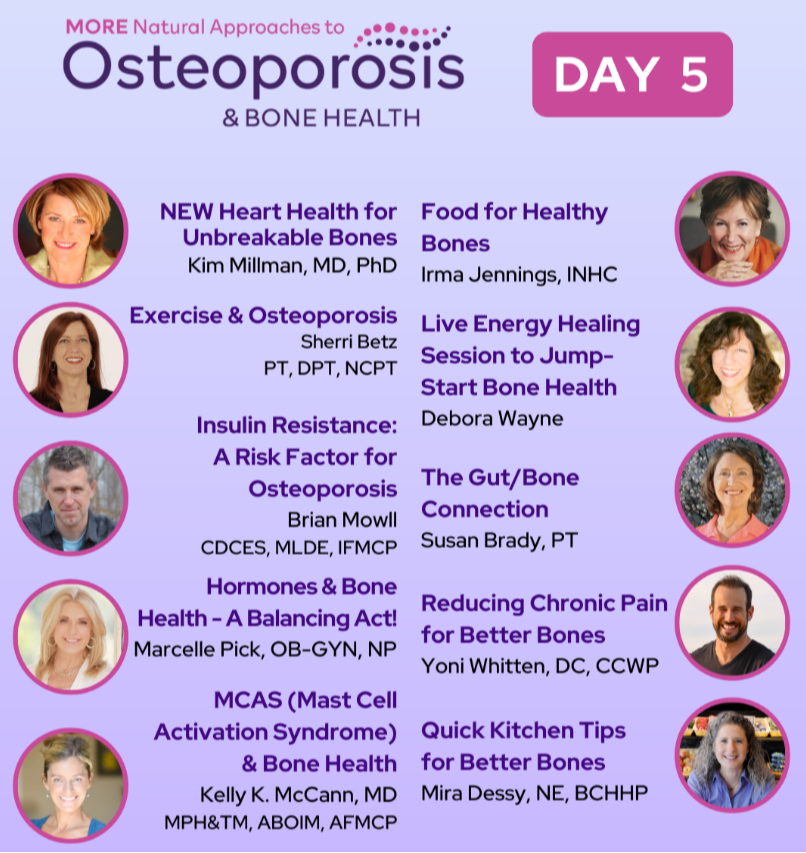 Day Five you'll learn what exercises and “bracing” you can do if you have an osteoporosis fracture and exercises to help prevent fractures. ALSO - Discover the critical role that your gut, hormones, and blood sugar play when it comes to your bones. Learn about bone-healthy foods you can easily add to your diet as well as kitchen tips.