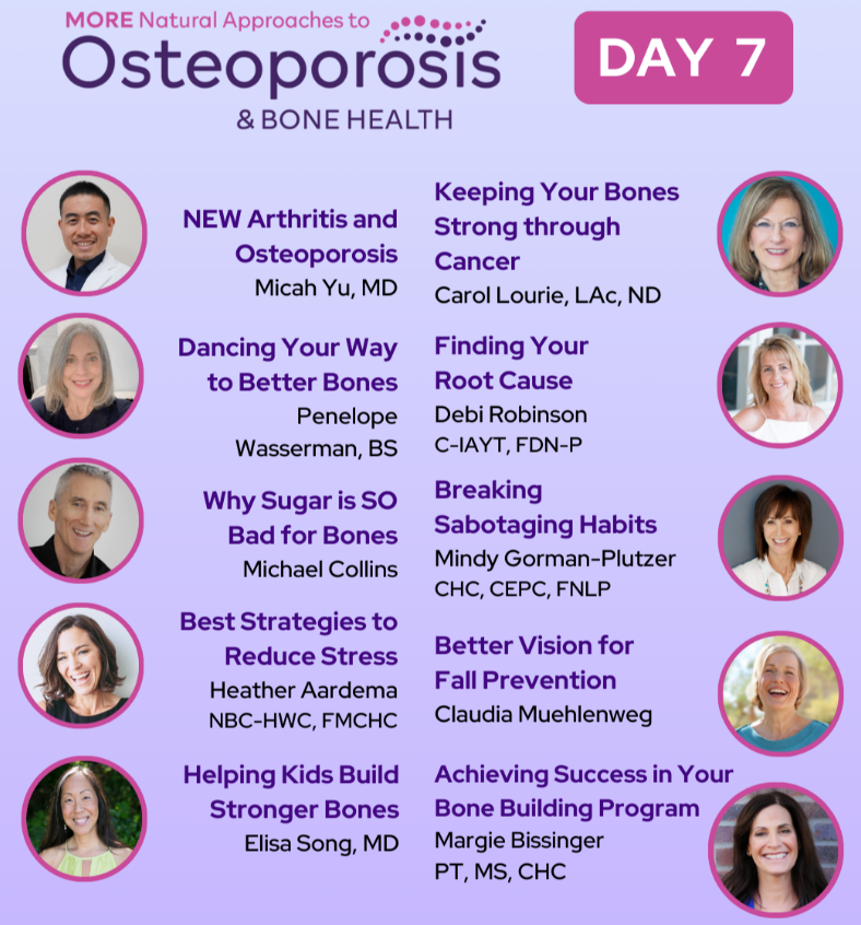 On Day Seven we'll explore the connection between osteoporosis and arthritis and what can be done to reduce pain and inflammation. We will look at blood sugar control and why it is critical for bone protection. Discover how to break self-sabotaging eating habits, including sugar addiction. We’ll share tips for utilizing the resources from the summit to start your personal bone-building plan. Find out what needs to be done to keep your bones strong during and after cancer treatment. Â