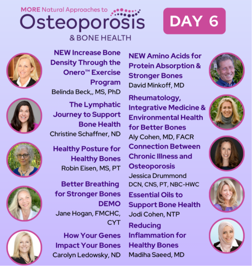 Day Six is a must-attend day for expert health information. You will learn about the effective Onero ™ bone strengthening program and how amino acids are essential for protein absorption. Explore how your lymphatic system is key to detoxifying, whether it’s from your environment or a gene mutation, like MTHFR. Learn why inflammatory foods are the fast path to bone loss, and learn how to use Feldenkrais exercises to enhance alignment.